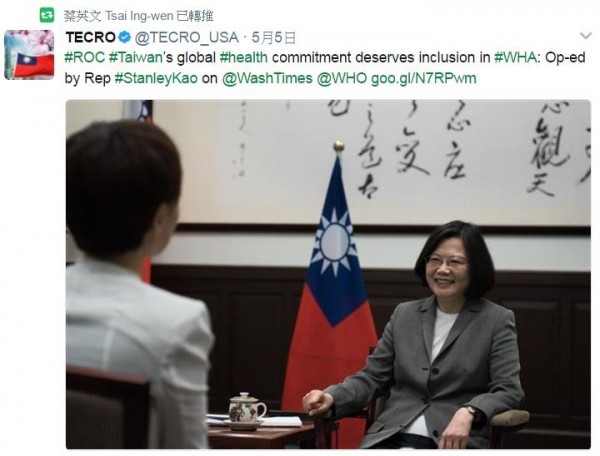 WHA邀請進入倒數 蔡英文9度推特發文 - 政治 - 自由時報電子報"表達台灣對世界健康所付出的貢獻,不應該被排除在WHA大會之外。"