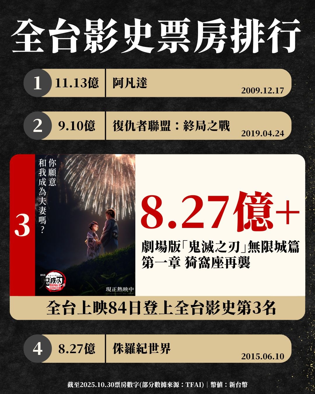 《劇場版「鬼滅之刃」無限城篇 第一章 猗窩座再襲》全台上映84日(截至10/30)累積票房突破➡️新台幣8.27億