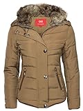 DAMEN WINTER JACKE GEFÜTTERT STEPP DAUNEN OPTIK FELL KAPUZE SKIJACKE KURZ MANTEL, Farbe:Camel;Größe:S -
