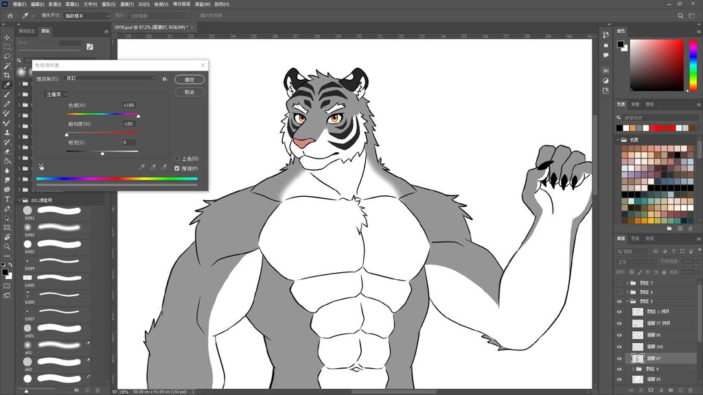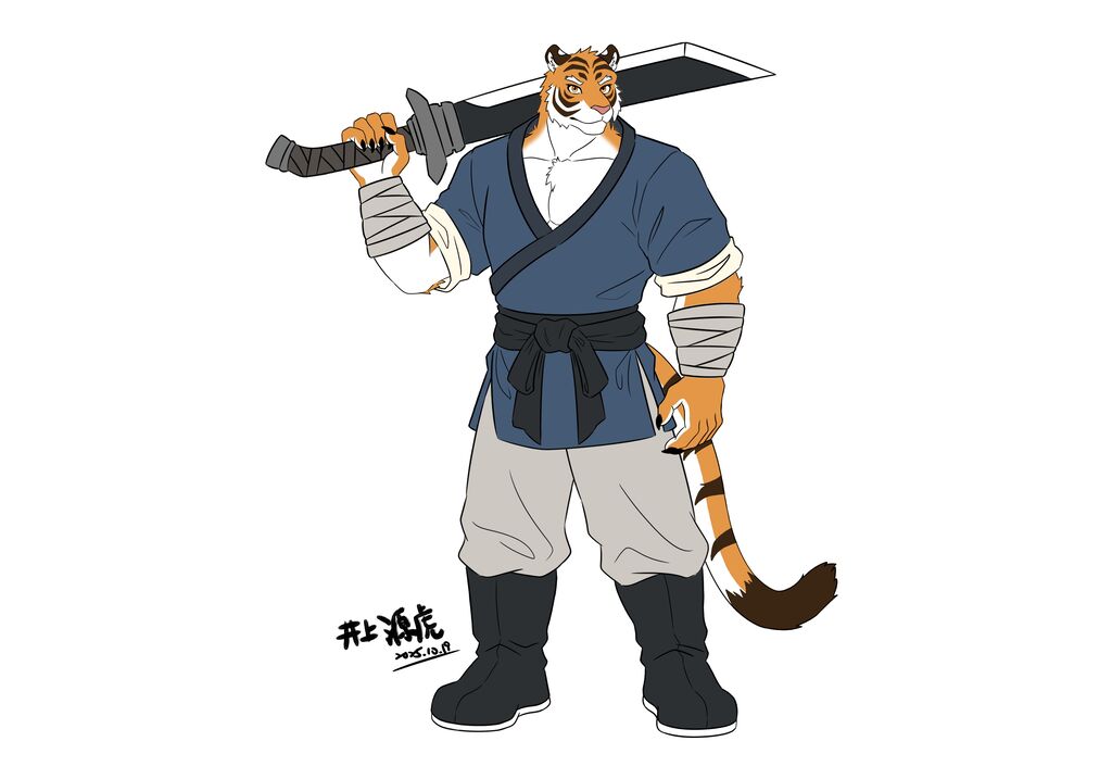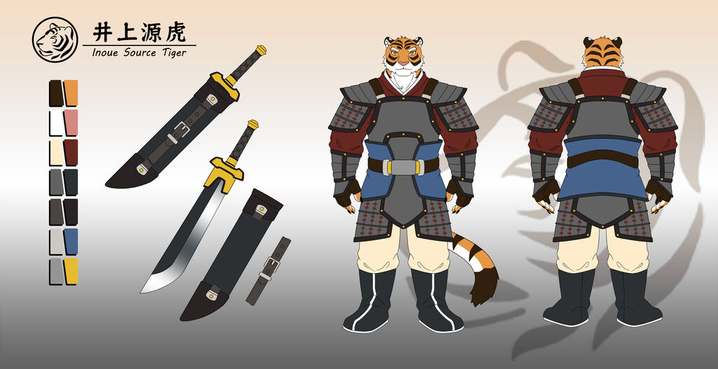 主身分穿著古代中式鎧甲 ( 甲冑 )的老虎獸人武將,其他身分太空人、聖騎士、釀酒杜氏