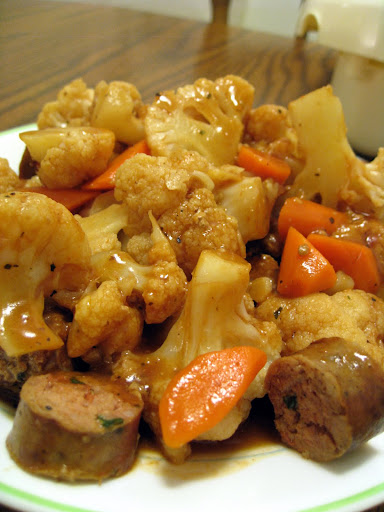 今天晚餐:茄汁燴白花菜與義式香腸。香腸讓平淡的白花菜有了義大利風味,大人小孩都喜歡!