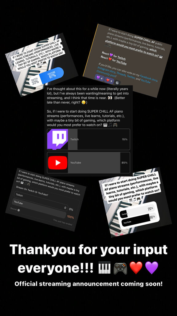 If I were to start doing SUPER CHILL AF piano streams (performances, live learns, tutorials, etc.), with maybe a tiny bit of gaming, which platform would you most prefer to watch on? 🎹🎵🎮