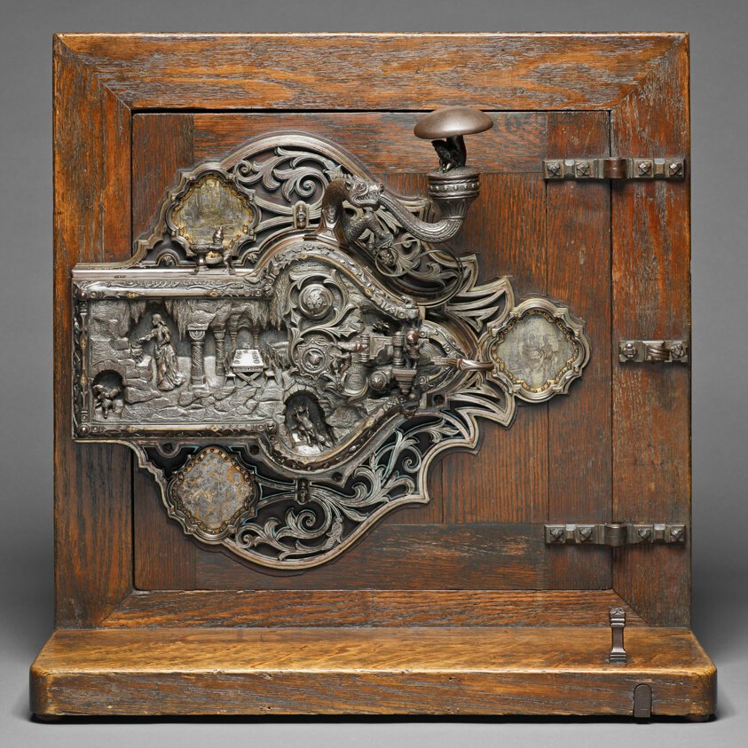這是白雪公主和七個小矮人主題的保險箱,在西元1911年做成的。