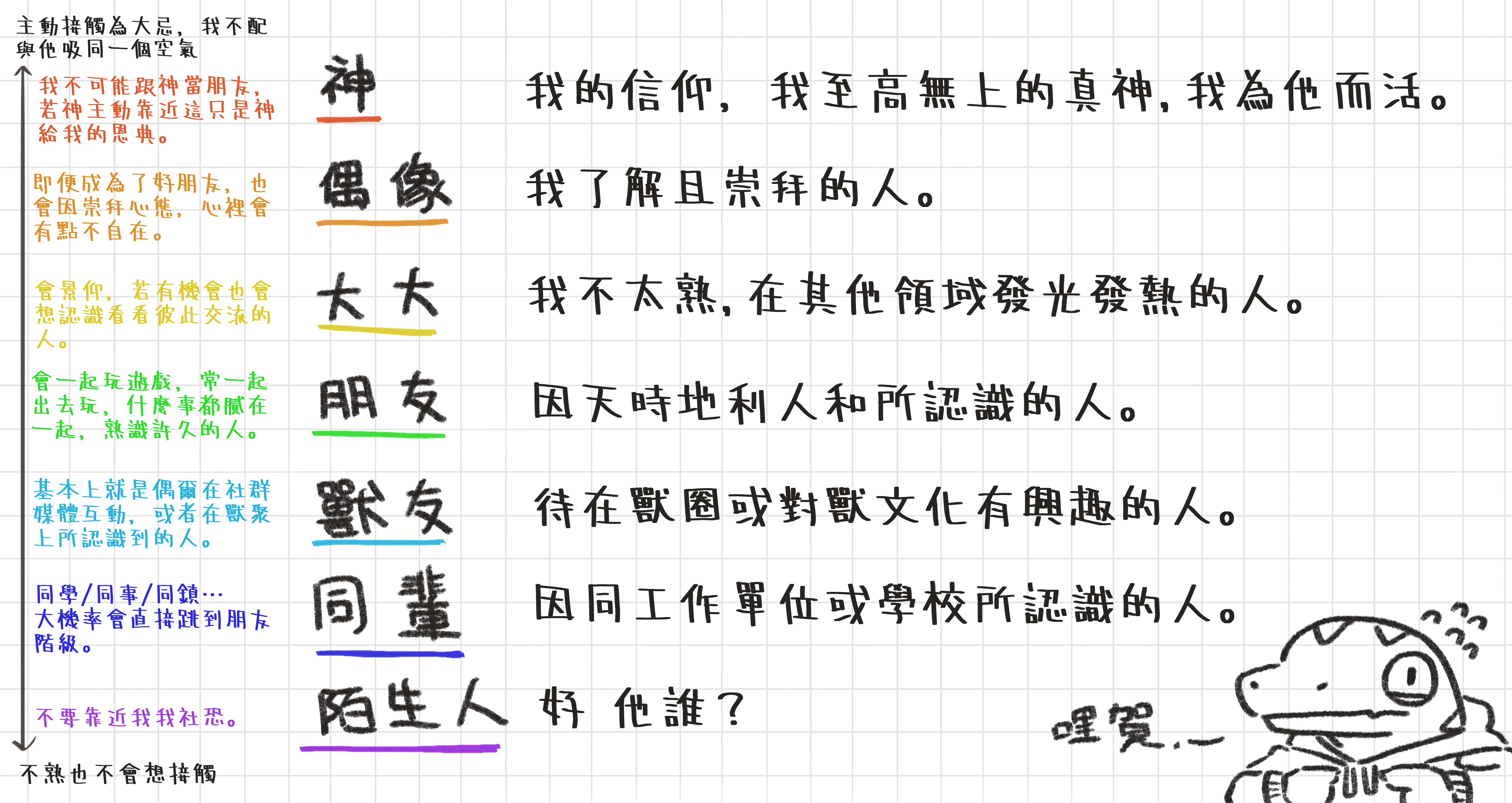 基本上我任何不太敢接觸或不親近的狀態,都取決於我當時是怎麼知道你這個人,並且放到我底下這酷酷的✨蜥蜥熟識程度表✨內