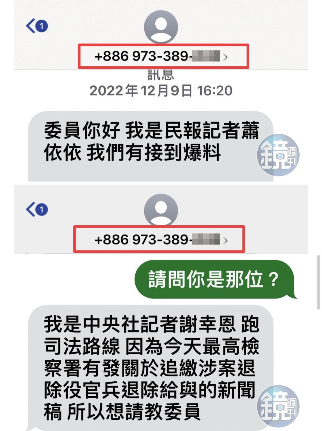 林楚茵立委:「2022年12月9號,有個誰都沒看過的民報蕭依依傳簡訊給我,問我民進黨府院黨幕僚都加入某網軍群組的事是否為真,我沒有回,下午同個電話傳訊來問其他問題,我就回訊你誰,她回我是中央社謝幸恩.
