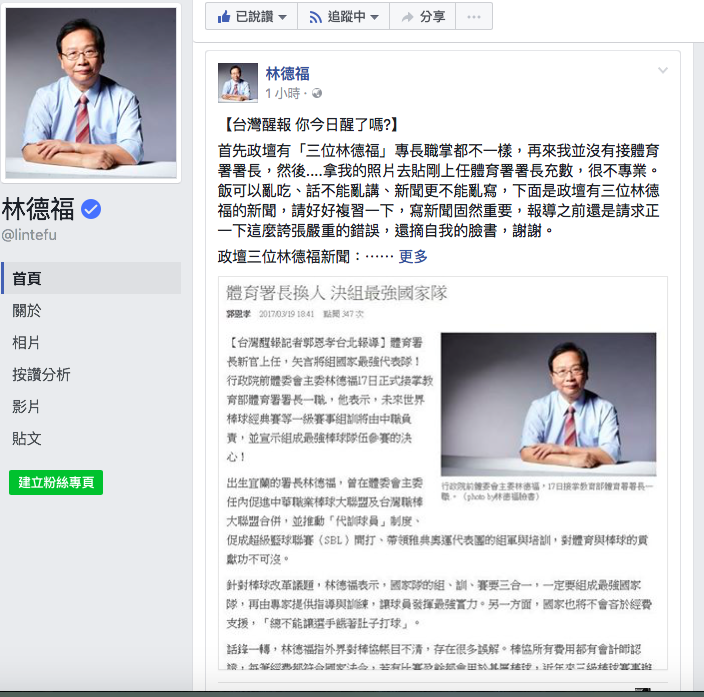 糗!遭誤植照片接體育署 林德福:新聞不能亂寫 | 新頭殼 newtalk