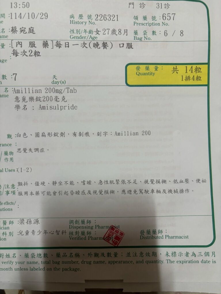 宛庭,1997/2/3出生,從國二開始吃精神藥直到現在,病情反反覆覆,會發很多疾病噗,2024/10/3開始打兩個禮拜一次長效針